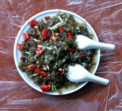 【 酸辣子炒沙蘿菇 】 當(dāng)?shù)卮合募居旰?,山頭巖石壁上生長的墨綠色地菇——地衣(本地名為沙蘿菇),采集后用清水反復(fù)多沖洗幾次。再用壇子腌的酸辣椒和大蒜一起炒熟,出鍋后灑些許香蔥即成一道色、香、味俱全的地方特色小吃。