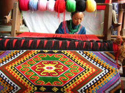 土家語中的“西蘭卡普”是一種土家織錦。“西蘭”是“被面”,“卡普”即“花”,“西蘭卡普”就是土家族的花鋪蓋,是土家姑娘的珍貴嫁妝。西蘭卡普多以絲、棉、麻為原料,一般以紅、藍、青三種顏色為經(jīng)線,緯線可以自由選擇顏色。用古式織機、挑花刀采取通經(jīng)斷緯、反面挑織的方法手工挑織而成。西蘭卡普構圖大方,織工精巧,花樣豐富,色彩鮮明熱烈而古樸,被稱為土家文化的活化石。