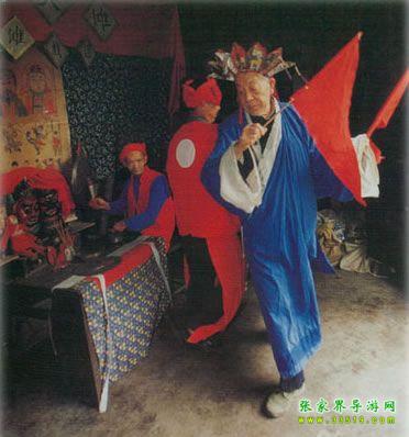 儺戲在湘西土家族地區(qū)也稱儺堂戲、儺神戲,它與土家族原始巫教、巫術(shù)的關(guān)系極為密切。土家族先民信奉的神有儺神、八部大神、土地神等,作為一種宗教活動(dòng),這種原始信仰與社會(huì)生產(chǎn)活動(dòng)、文娛活動(dòng)及民族習(xí)俗是融為一體的,因此儺戲最先的“沖儺還原”帶有明顯迷信色彩,土家族群眾中有“一儺沖百鬼,一愿了千神”的說法,湘西土家族人干脆叫它為“神戲”。湘西土家族儺戲的發(fā)展過程大體是儺、儺舞、儺儀然后才產(chǎn)生儺戲。儺舞源于久遠(yuǎn)的蒙昧?xí)r期,土家先民們?cè)谕笞匀蛔鞫窢?zhēng)、同毒蟲猛獸作斗爭(zhēng),便產(chǎn)生了化裝護(hù)面、在鼓樂聲中奔騰呼號(hào)、沖殺跳躍的原始儺舞,其所模擬的鳥雀舞、猿猴舞、熊舞等頗為壯觀。儺舞與儺這種驅(qū)鬼消災(zāi)的祭祀儀式結(jié)合后,增加了祈求人獸平安、五谷豐登、緬懷祖先、勸人去惡從善、以及傳播生產(chǎn)知識(shí)等內(nèi)容,這就逐漸形成了兼?zhèn)潢U弘教義及娛樂性質(zhì)的祭祀風(fēng)俗歌舞。[2]土家族儺戲就是在此基礎(chǔ)上發(fā)展起來的。部分土家族學(xué)者認(rèn)為土家族儺戲的遠(yuǎn)源可以追溯到戰(zhàn)國時(shí)代的《九歌》,《九歌》是土家族儺戲的雛形,他們的依據(jù)是當(dāng)時(shí)楚國的沅湘流域,人們“信巫鬼、重淫祀”(《漢書·地理志》),從而使得“陰陽人鬼之間,又或不能無褻慢淫荒之雜”(宋代朱熹《楚辭集注》)。屈原正是加工整理了這一類“鄙陋”之詞,才創(chuàng)作出《九歌》、《天問》等名篇。也有部分學(xué)者不贊同這種論點(diǎn),他們認(rèn)為土家族儺在宋代還停留在儺祭和儺舞階段,最遲到明代,土家族儺才發(fā)展成為儺戲[3]。嘉靖《常德府志》記載:“歲除,歲將盡數(shù)日,鄉(xiāng)村多用巫師,朱裳鬼面,鑼鼓喧舞竟夜,名曰還儺。”文中未點(diǎn)明“儺戲”二字,但卻使用了“還儺”一詞,這與今天民間對(duì)儺戲的稱呼相似。又據(jù)清乾隆《永順縣志》載:“永俗酬神,必延辰郡巫師唱演儺戲,……至晚,演儺戲。敲鑼擊鼓,人各紙面一,有女裝者,曰孟姜女;男扮者,曰范七郎。”在土家族儺戲中,孟姜女傳說故事占著非常重要的地位。在湘西土家族地區(qū),儺戲一般有二十四正戲,即二十四戲神。每次儺儀結(jié)束時(shí),巫師要用香火在黃裱紙上燒二十四個(gè)洞,以表示奠祭二十四戲神。民間有諺語:“儺神菩薩不識(shí)字,只要二十四個(gè)圈圈滿。”在二十四儺神中,被稱為勾愿神的姜女、范郎是還儺愿時(shí)非常重要的兩位神靈。在儺戲中,《孟姜女》是整場(chǎng)的高潮,平時(shí),儺戲唱完后,由沒下裝的孟姜女、范郎去向主人家及觀眾“拜臺(tái)”,以示“了愿”。清代中期以后,儺戲吸取了花燈、陽戲、高腔等其他地方戲劇劇種的唱腔和劇目,逐漸變得日益成熟。我們仔細(xì)查看了全國371個(gè)劇種,發(fā)現(xiàn)儺戲、花燈戲有著相同的班社,也就是說一個(gè)演出班社可以演出儺戲、花燈戲兩個(gè)劇種。這段時(shí)期,儺戲已作為獨(dú)立戲劇劇種參加演出。由于儺戲是由巫儺法事演變而成的戲劇形式,經(jīng)歷著巫儺法事(驅(qū)鬼祭祀)、儺壇上戲和儺堂正戲的發(fā)展過程。