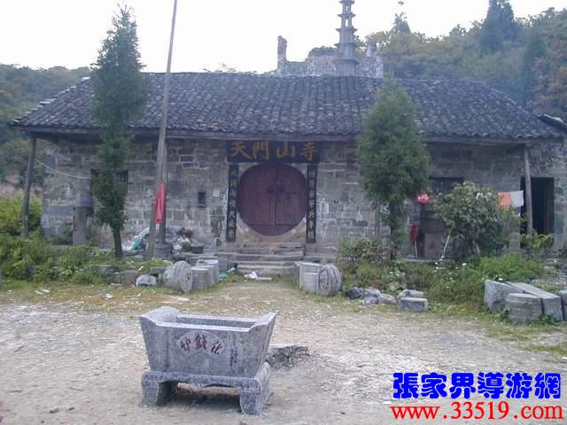 (天門(mén)山寺)天門(mén)山寺最早建于唐代,古稱(chēng)云缽庵、靈泉院、嵩梁堂,明代時(shí),因擇址不當(dāng)而屢遭風(fēng)摧又常遭水荒,才將天門(mén)山寺從東部山頂遷移至此。以前這里古木參天,濃蔭蔽日。古寺門(mén)楣上刻有“天門(mén)仙山”四字,大門(mén)兩邊的對(duì)聯(lián)是:“天外有天天不夜,山上無(wú)山山獨(dú)尊”,傳為李自成部將野拂撰書(shū)。進(jìn)門(mén)為大佛殿后面有觀音堂,兩邊六間平房,最后一棟是祖師殿,規(guī)模宏大。民間概括為“三進(jìn)堂、六耳房,磚墻鐵瓦鍋如壙”。山寺原建筑十分講究,飛檐翹角,雕龍畫(huà)鳳,并塑有佛道神像菩薩等。還有大鼓一面,千斤大鐘一口,一座七級(jí)石塔和一個(gè)大化錢(qián)爐。據(jù)碑刻記載,自清乾隆至民國(guó)五年的163年間,天門(mén)山寺共修葺過(guò)七次,香火曾盛極一時(shí),湘鄂川黔邊境十多個(gè)縣的信徒絡(luò)繹不絕,都來(lái)這里進(jìn)香拜佛?,F(xiàn)天門(mén)山旅游股份有限公司正在大規(guī)模地修復(fù)天門(mén)山寺,昔日的繁華又將重現(xiàn)。