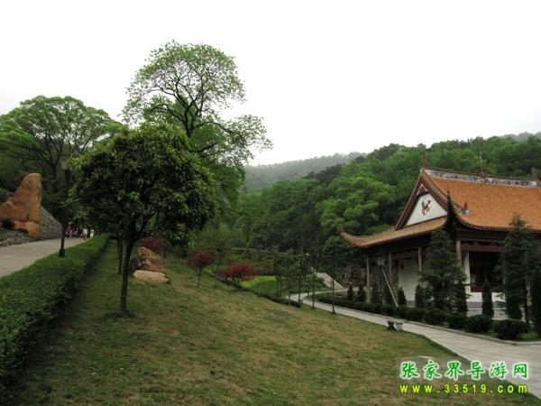 轉(zhuǎn)到祠堂后邊,有一短坡,草色蒼綠,雜有香楓,高不及數(shù)尺。右有一潭,約五尺圓盤,潭水清澈,右岸樟樹兩棵,挺撥林立,樹旁瀑布寬約兩尺,高約兩人,水沫飛濺,水擊聲轟轟,如約大壩泄洪。潭之左邊,有一石梯,拾級而上,就見岳麓山上煙雨蒙蒙,那濃濃的霧水,就像一個打扮得漂漂亮亮的姑娘披上潔白的婚紗——更加嫵媚動人。