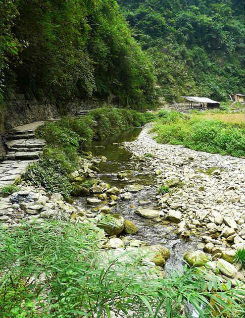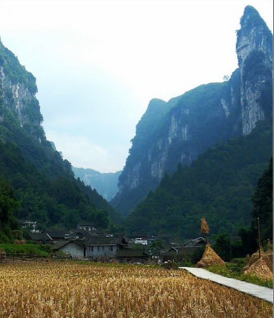 村寨四周山勢(shì)雄奇,絕壁夾天;“夯峽”、“九龍”、“玉泉”三溪在這里相會(huì),如同三根彩帶在這里相交結(jié)。這里是風(fēng)景區(qū)的中心,一萬(wàn)五千多米長(zhǎng)的青石板路從這里一直通向各個(gè)景點(diǎn)這里還是一個(gè)角度十分好的觀景臺(tái),人立于此,只要原地轉(zhuǎn)動(dòng)身子,就可觀賞到東西南北全方位的各個(gè)景點(diǎn),那含情脈脈的“相依巖”、昂首奮蹄的“駟馬峰”、惟妙惟肖的“孔雀開屏”五彩繽紛的“彩云壁”和“畫屏峰”……盡在眼中無(wú)不景象萬(wàn)千,令人目不瑕接。詩(shī)人石元機(jī)贊曰: