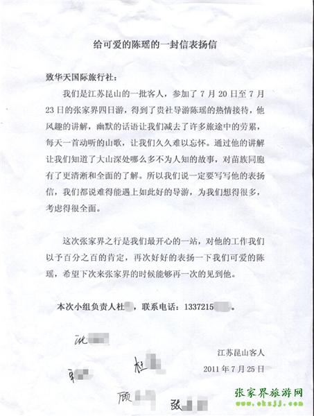 游客杜小姐一行為表揚導(dǎo)游陳瑤寫來表揚信致我張家界華天國旅