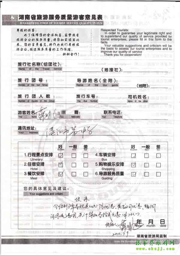 2010年7月9日蔡先生旅游質量反饋